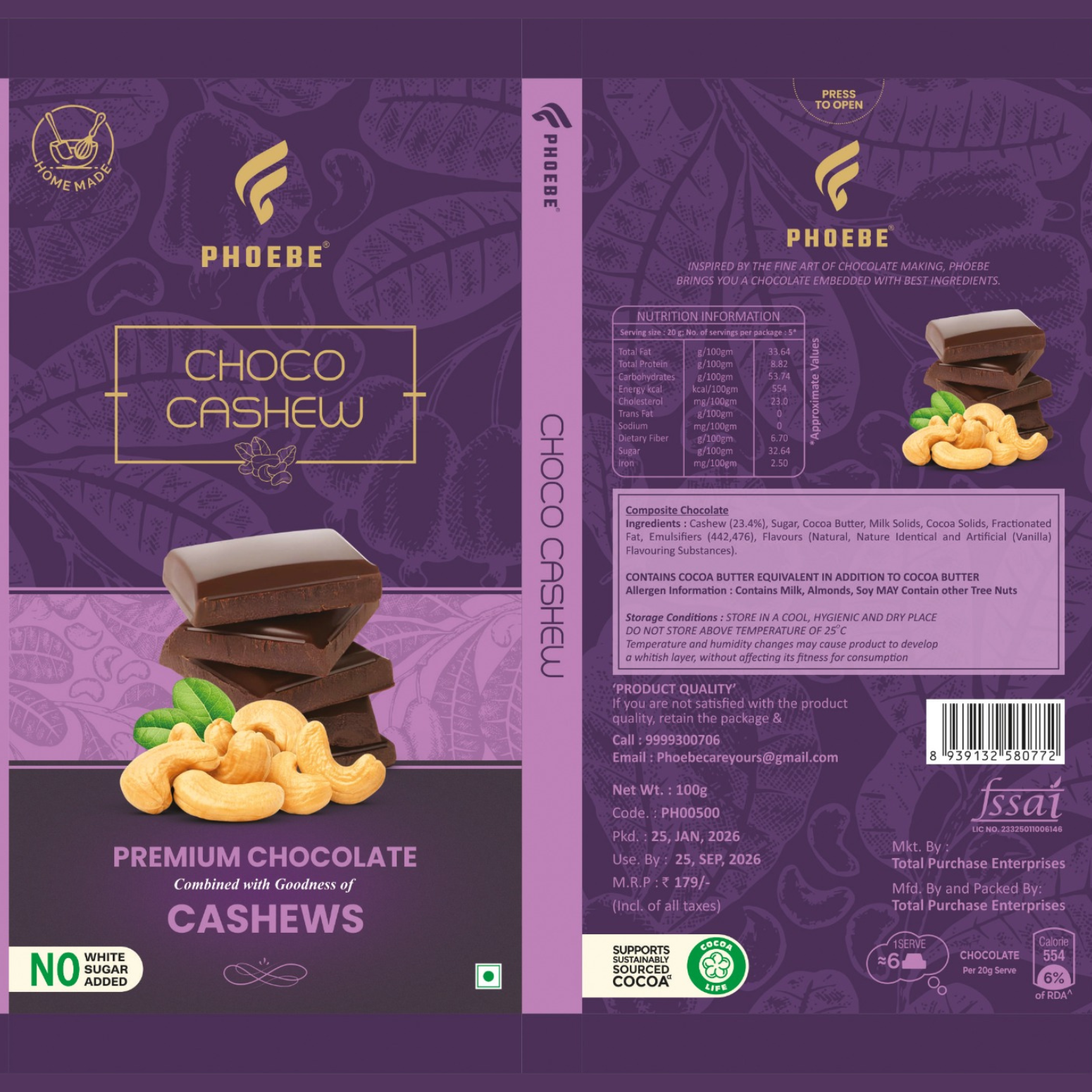 Ingredients: Cashew (23.4%), Sugar, Cocoa Butter, Milk Solids, Cocoa Solids, Fractionated Fat, Emulsifiers (442,476), Flavours (Natural, Nature Identical and Artificial (Vanilla) Flavouring Substances).